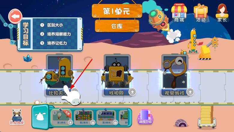 2、參與游戲學習:進入對應學習模塊,孩子跟隨可愛人物形象參與游戲化教學環(huán)節(jié),按提示完成互動操作,在闖關過程中掌握思維知識與技能,邊玩邊學。