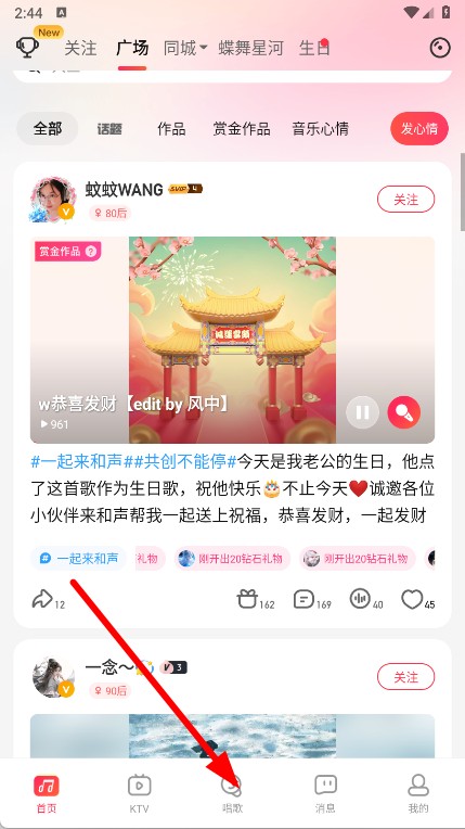 1、打開(kāi)APP,點(diǎn)擊底部導(dǎo)航欄中的唱歌選項(xiàng)。