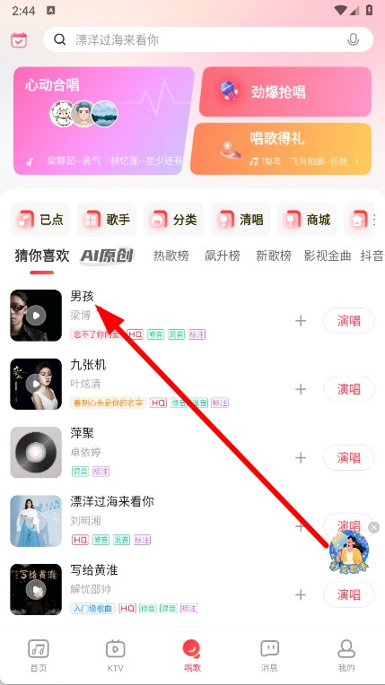 2、在歌曲列表中,選擇你想演唱的歌曲。