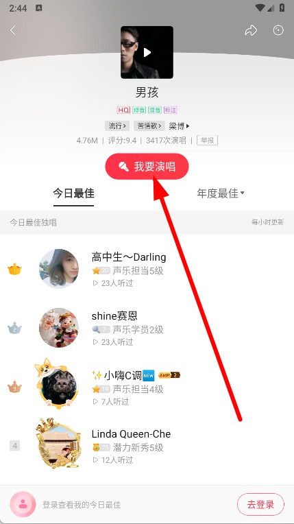 3、進(jìn)入歌曲詳情頁(yè)面后,點(diǎn)擊我要演唱按鈕。