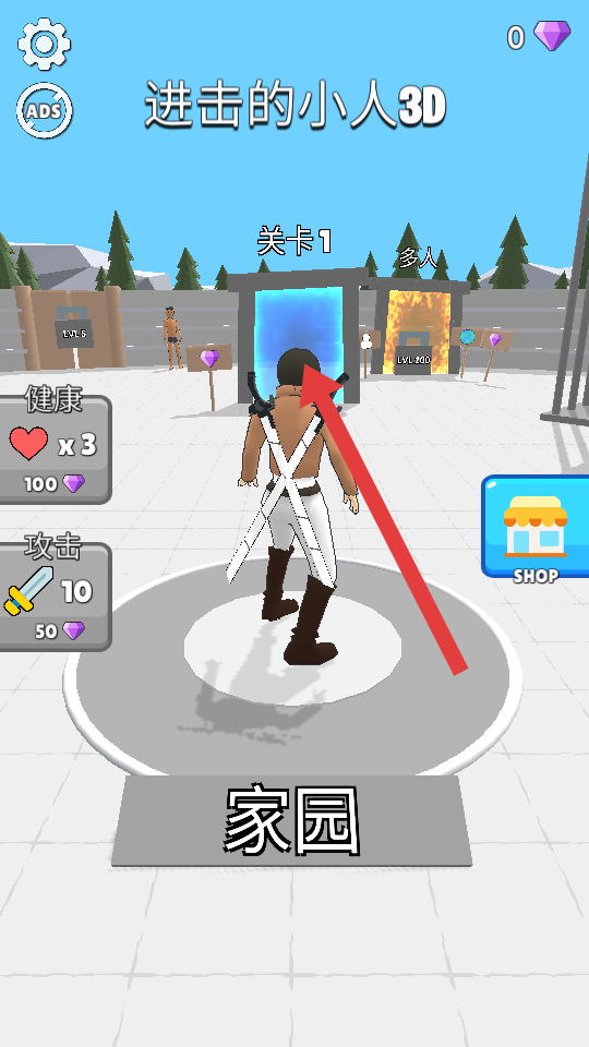 1、在進(jìn)擊的小人3D游戲的家園界面,點(diǎn)擊關(guān)卡1的傳送門(mén)進(jìn)入游戲,界面中可看到角色的健康和攻擊屬性,以及商店入口。
