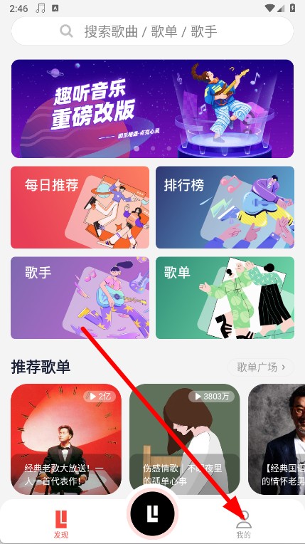 1、打開(kāi)趣聽(tīng)音樂(lè)APP,點(diǎn)擊右下角我的。