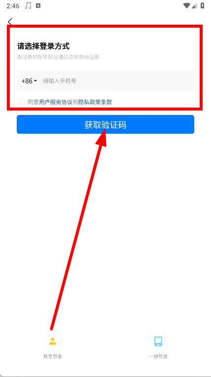3、在登錄頁(yè)面,輸入手機(jī)號(hào),勾選后,點(diǎn)擊獲取驗(yàn)證碼。