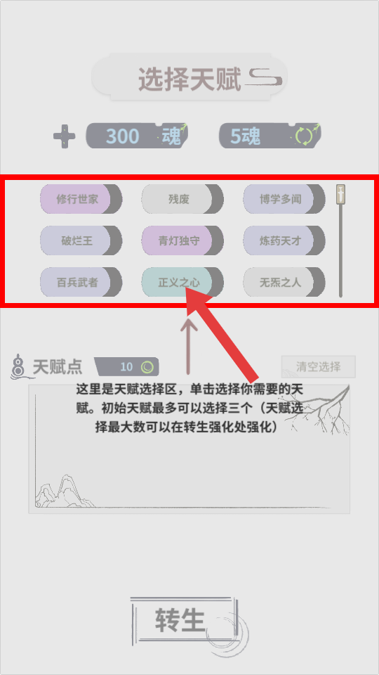 1、在修仙類游戲的天賦選擇界面,可選擇正義之心等天賦,初始最多選擇三個(gè)天賦,天賦選擇可增強(qiáng)角色屬性特殊能力。
