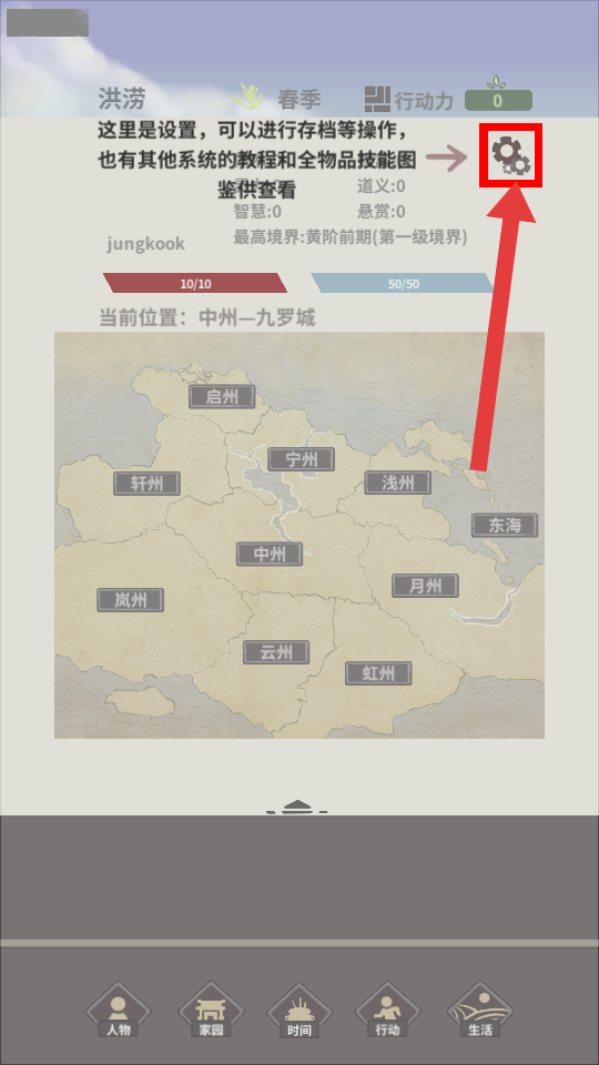 2、點(diǎn)擊設(shè)置按鈕,可進(jìn)行存檔、查看系統(tǒng)教程和物品技能圖鑒等操作,設(shè)置功能為游戲進(jìn)程管理和玩法理解提供了便利。