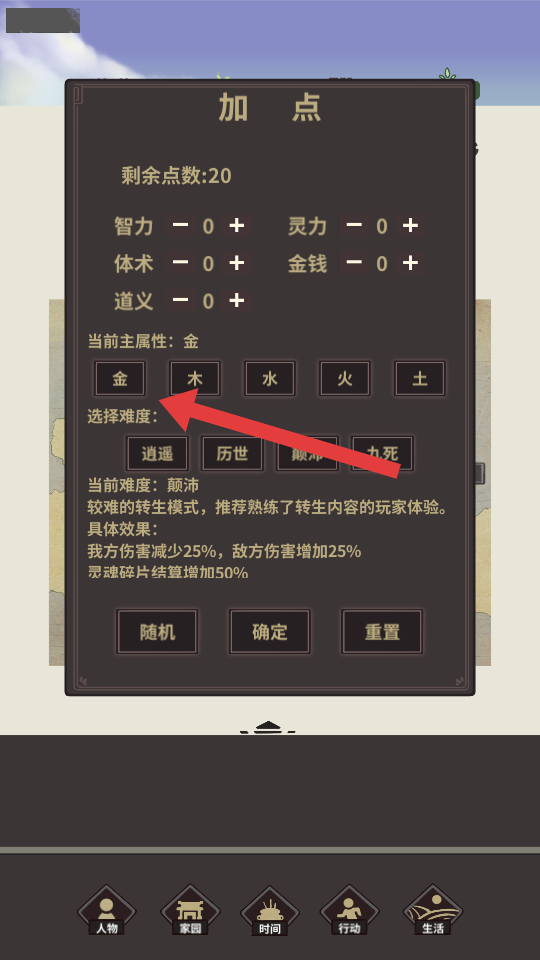 3、在加點(diǎn)界面,可選擇主屬性木等五行屬性,不同屬性對應(yīng)不同的修煉方向和難度,選擇木屬性可發(fā)展相應(yīng)的修仙流派。