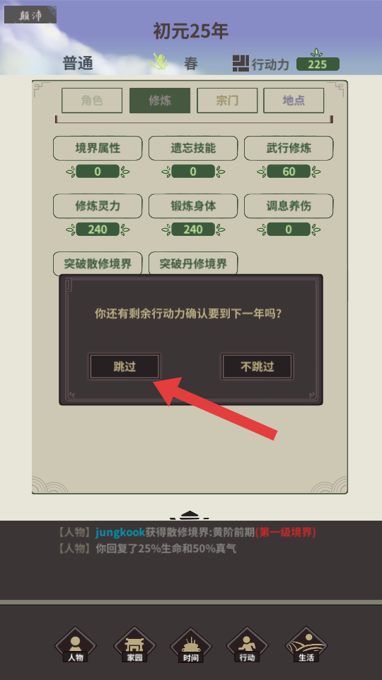 4、在修煉界面,當(dāng)有剩余行動(dòng)力時(shí),可選擇跳過到下一年,快速推進(jìn)游戲時(shí)間,進(jìn)行更多的修煉和冒險(xiǎn)活動(dòng),提升境界。