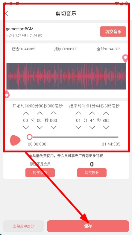 4、進(jìn)入剪切音樂編輯界面,設(shè)置開始時(shí)間、結(jié)束時(shí)間等,完成后點(diǎn)擊保存,即可完成音樂剪切。
