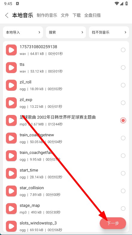 3、在本地音樂列表中選擇要剪切的音樂,點(diǎn)擊下一步。