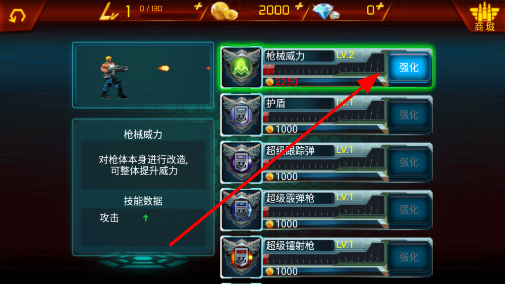 1、強化界面,可對槍械威力、護盾等進行強化,消耗相應(yīng)資源點擊強化,能提升槍械等的能力,讓角色在戰(zhàn)斗中更具優(yōu)勢。