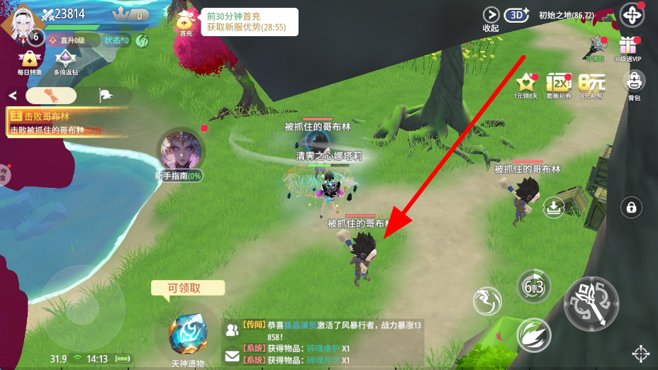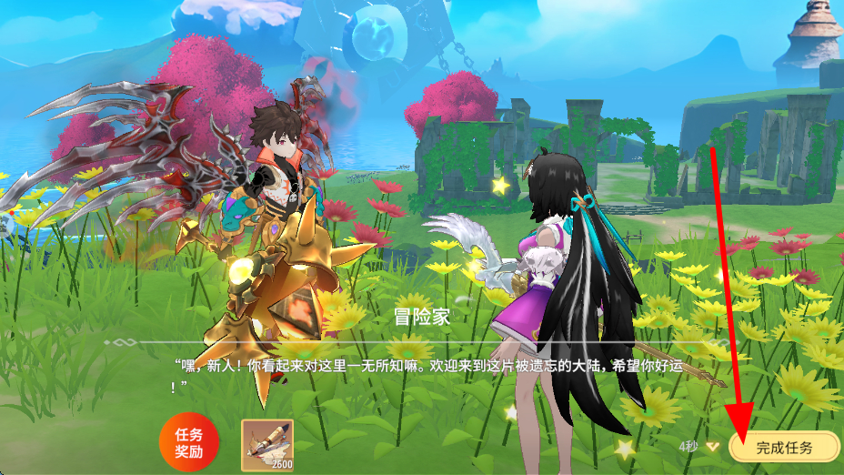 2、進入游戲后,會遇到NPC,與NPC對話,根據(jù)提示推進任務,任務完成后,點擊完成任務,可獲取任務獎勵,助力角色成長。