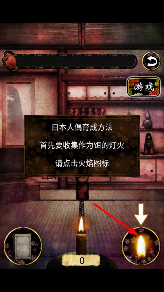1、在日式恐怖養(yǎng)成游戲中,點擊火焰圖標收集燈火,這是育成人偶的基礎操作,界面中的日式房間場景充滿懸疑氛圍。
