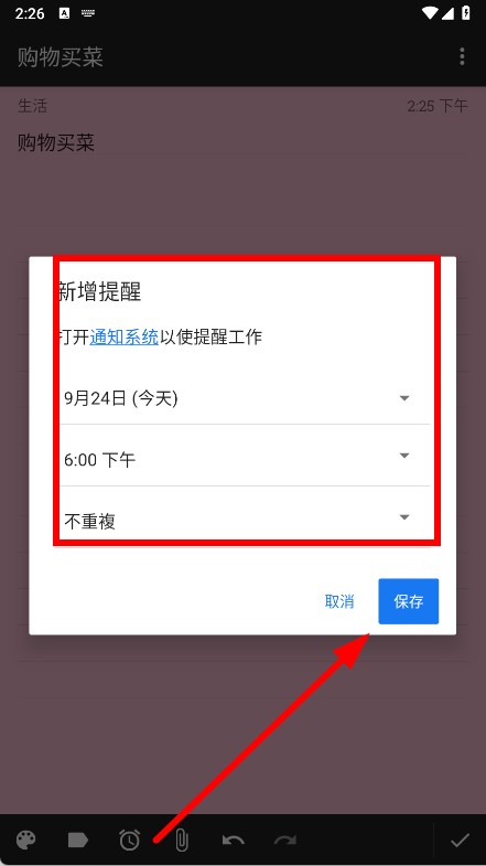 3、點(diǎn)擊底部的鬧鐘圖標(biāo),設(shè)置提醒時(shí)間,點(diǎn)擊保存。