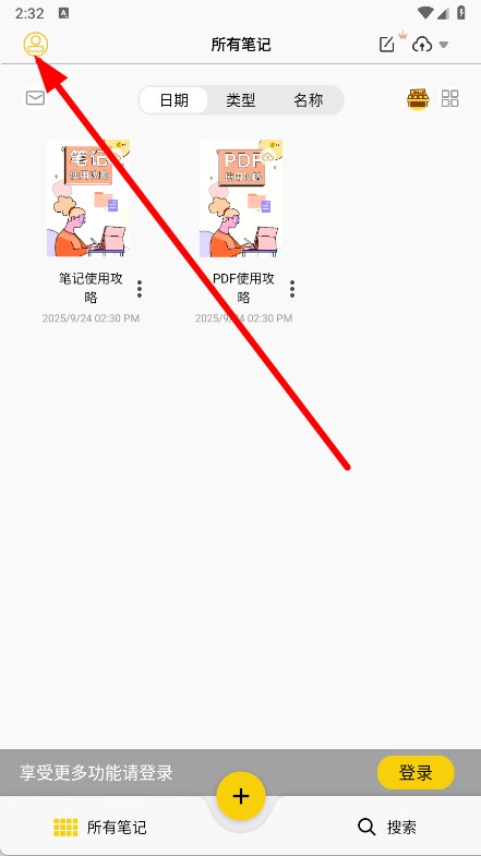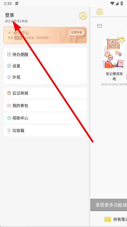 1、打開(kāi)云記APP,點(diǎn)擊左上角的個(gè)人中心圖標(biāo)。