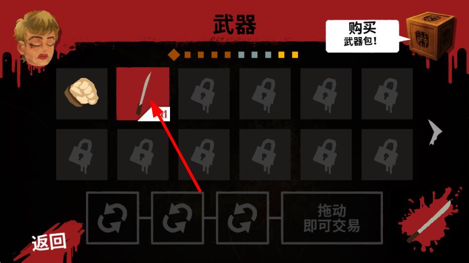 4、進入武器界面后,可選擇刀作為武器,裝備后能提升角色的攻擊能力,在遭遇敵人時可用于自衛(wèi)或反擊,助力通關(guān)。