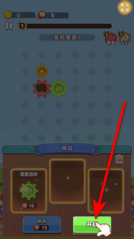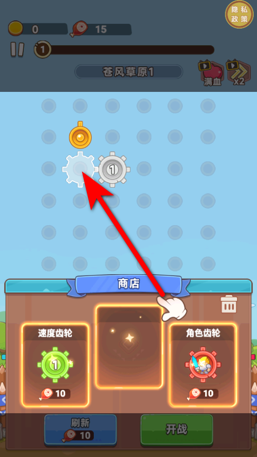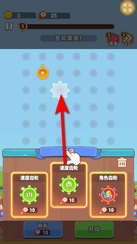 1、進入商店,用收集的道具兌換速度齒輪,把兌換到的速度齒輪放置到上方網(wǎng)格里,這是構建戰(zhàn)斗陣容的第一步。