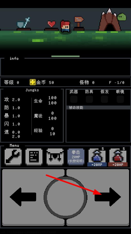 1、在游戲界面中,點(diǎn)擊右側(cè)方向按鍵,可操控角色向右移動,探索場景中的不同區(qū)域,尋找資源、怪物或任務(wù)目標(biāo)。