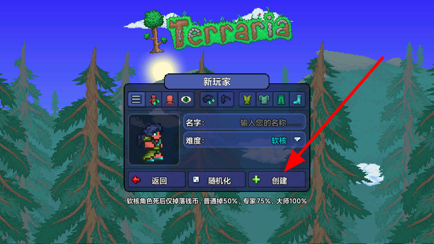 1、進(jìn)入角色創(chuàng)建界面,輸入角色名稱,選擇合適的難度,像軟核難度,角色死后僅掉落錢幣,之后點(diǎn)擊創(chuàng)建,即可生成角色開啟冒險(xiǎn)。