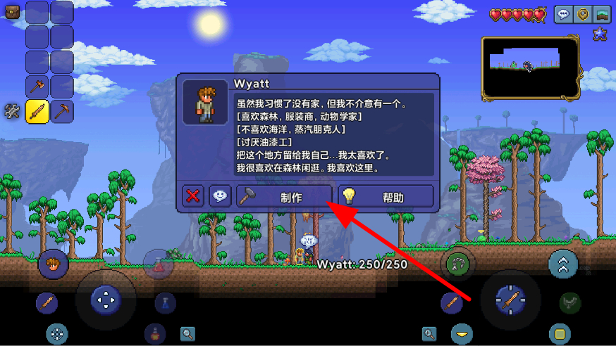 4、與NPC互動時(shí),可根據(jù)需求選擇制作或幫助等選項(xiàng),通過制作獲取所需物品,借助幫助解決遇到的問題,更好地在泰拉瑞亞世界冒險(xiǎn)。
