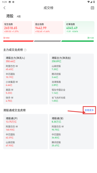 3、在成交榜頁面,點擊查看更多港股通板塊,進入港股通明細頁面。