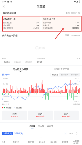 4、在港股通明細頁面,查看南向資金明細等信息,了解港股通交易數(shù)據(jù)。