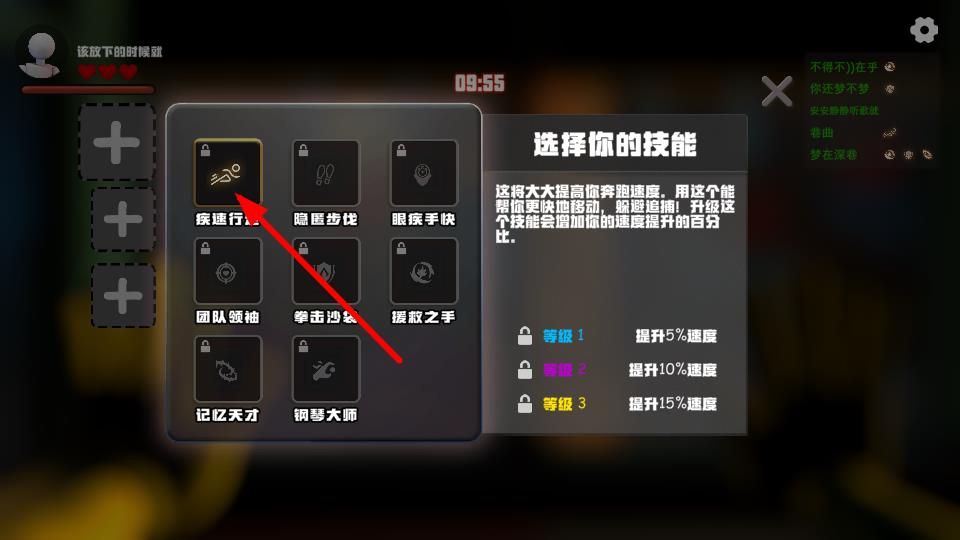 1、在技能選擇界面,優(yōu)先選擇疾速行技能,該技能可提升奔跑速度,助力更快移動(dòng)躲避追捕,升級后速度提升。