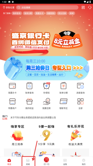 1、打開銀行APP,點(diǎn)擊底部商城選項(xiàng),進(jìn)入商城購物頁面。
