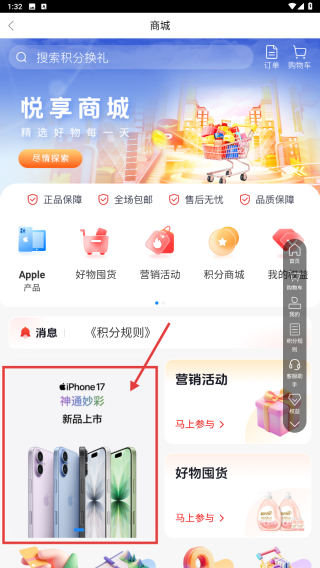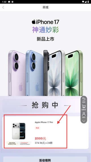 2、在商城頁面,點(diǎn)擊iPhone-17神通妙彩新品上市板塊,進(jìn)入蘋果手機(jī)商品頁。