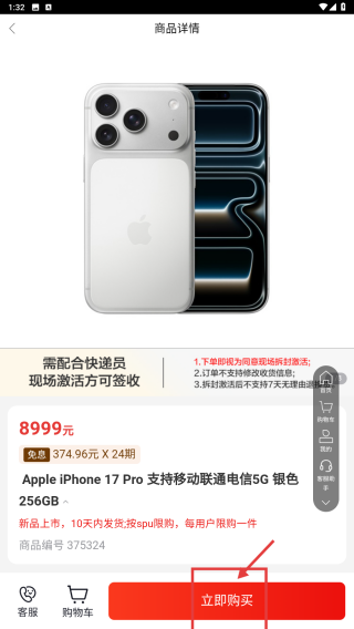 4、在詳情頁,點(diǎn)擊立即購買按鈕,發(fā)起商品購買操作。