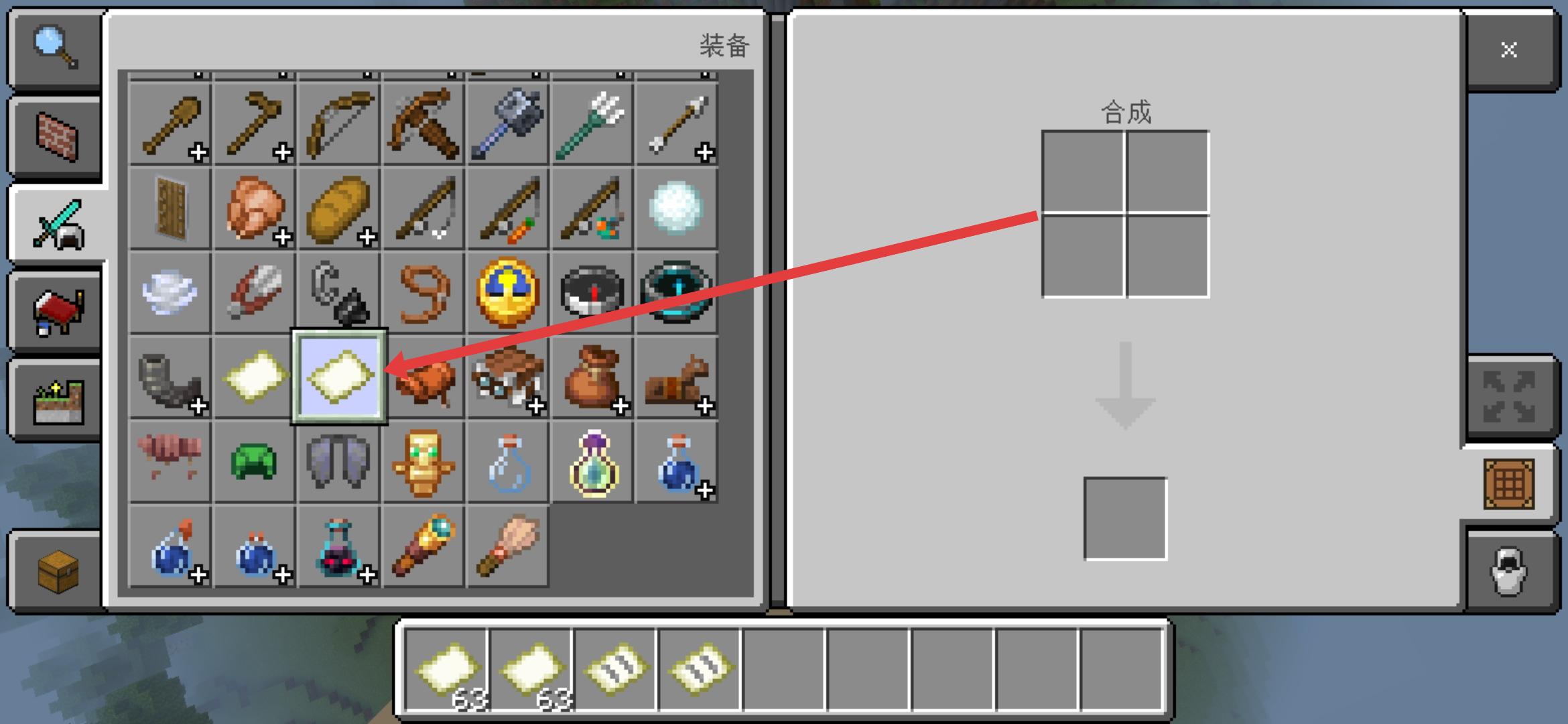 1、用3根甘蔗合成3張紙甘蔗多生于水邊,4個鐵錠+1個紅石合成指南針,打開工作臺,將指南針放中間格,周圍8格放紙,合成空白地圖。