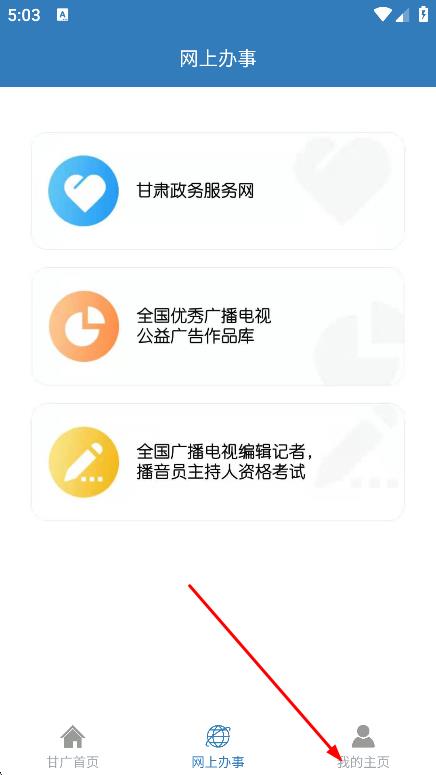 1、在網(wǎng)上辦事的頁面,點擊我的主頁,進入登錄頁面。