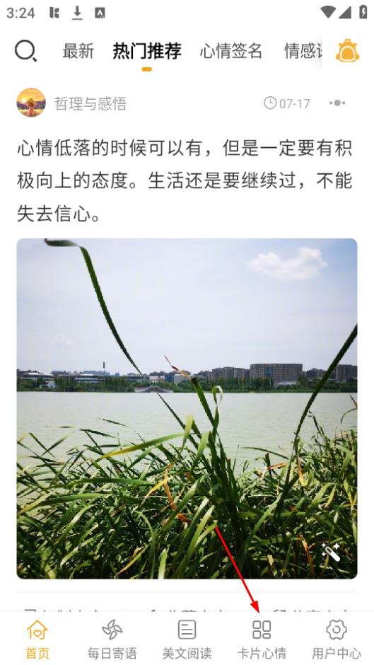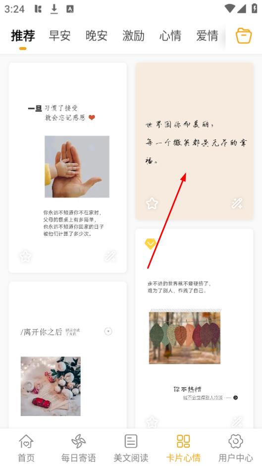 1、打開(kāi)一句話心情語(yǔ)錄,點(diǎn)擊頁(yè)面底部的卡片心情,進(jìn)入卡片心情頁(yè)面。