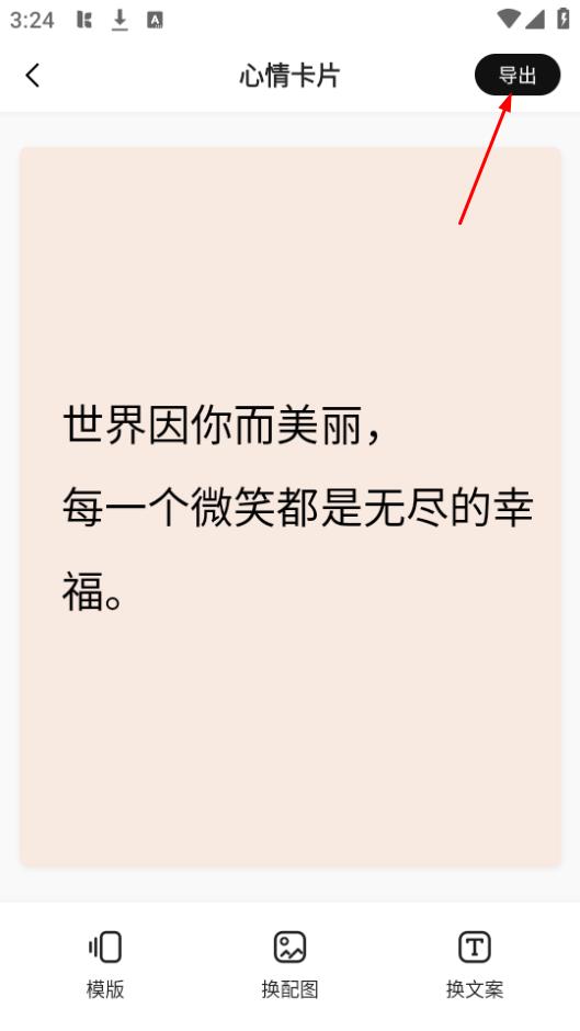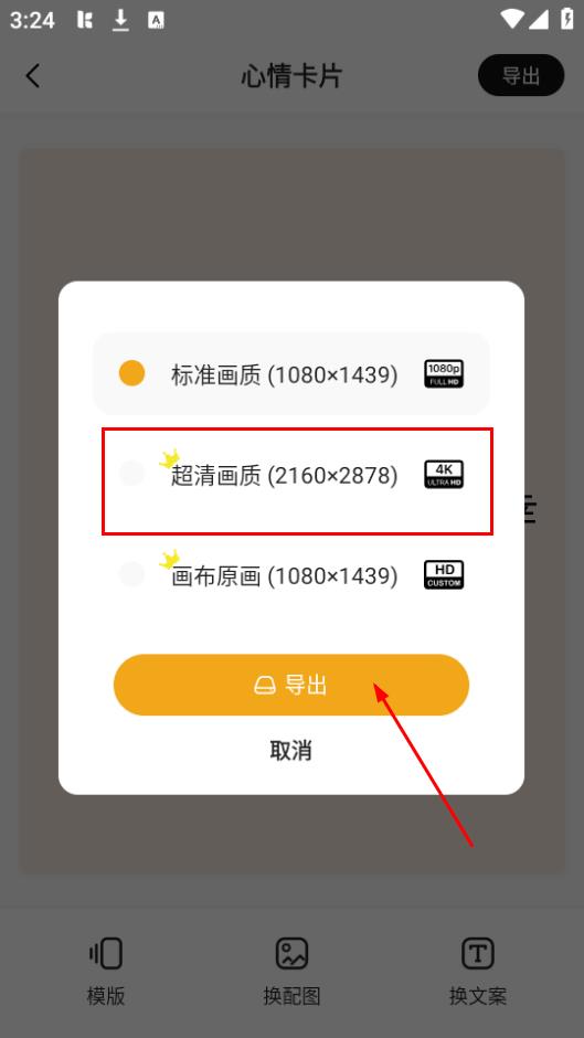 3、在心情卡片編輯頁(yè)面,點(diǎn)擊右上角的導(dǎo)出,彈出畫(huà)質(zhì)選擇彈窗。