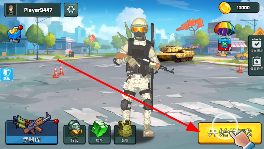 1、玩家進(jìn)入游戲后,點(diǎn)擊開始游戲,進(jìn)入戰(zhàn)斗準(zhǔn)備階段,為即將到來的射擊對戰(zhàn)做好準(zhǔn)備,開啟刺激的戰(zhàn)斗之旅。