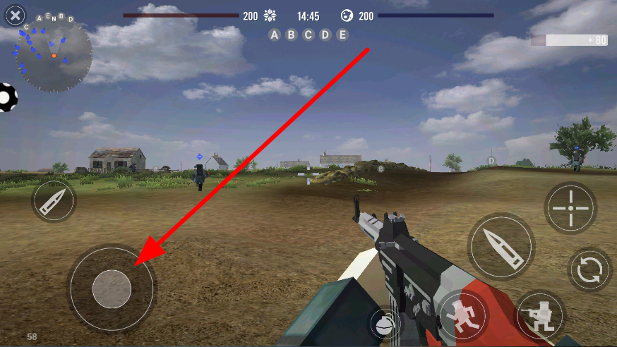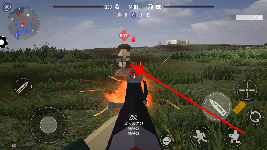 3、進(jìn)入戰(zhàn)場后,通過左側(cè)的操控區(qū)域,控制角色移動(dòng),在戰(zhàn)場中尋找敵人,準(zhǔn)備發(fā)起攻擊,推進(jìn)戰(zhàn)斗進(jìn)程。