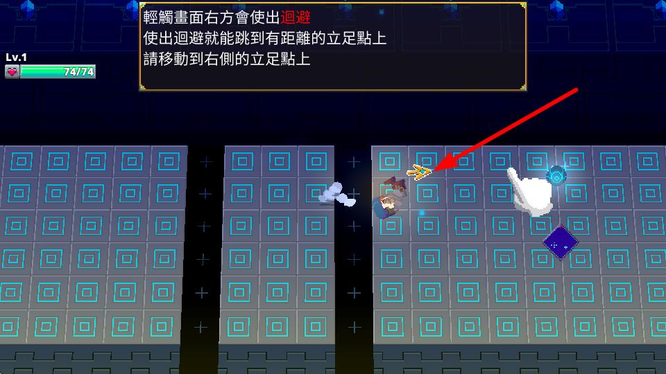 2、在游戲場(chǎng)景中,輕觸畫(huà)面右方可使出回避技能,使用該技能能跳到有距離的立足點(diǎn)上,按照提示移動(dòng)右側(cè)。