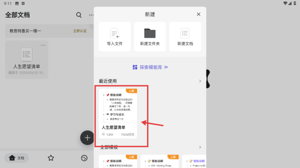 2、在新建功能菜單中,選擇人生愿望清單模板,進(jìn)入模板詳情頁。