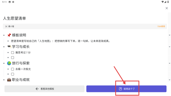 3、在模板詳情頁,點(diǎn)擊就用這個(gè)了按鈕,創(chuàng)建人生愿望清單文檔。