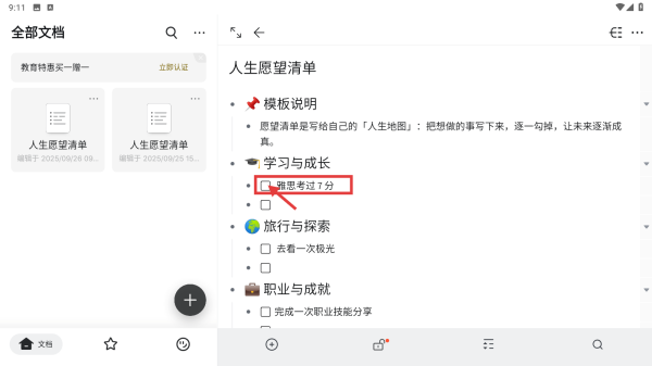 4、在文檔中,勾選雅思考過7分等愿望選項(xiàng),完成愿望清單的編輯。
