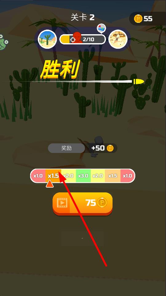 3、關(guān)卡勝利后,可獲取金幣獎(jiǎng)勵(lì),通過獎(jiǎng)勵(lì)進(jìn)度條可查看獎(jiǎng)勵(lì)倍數(shù),合適領(lǐng)取更多金幣。