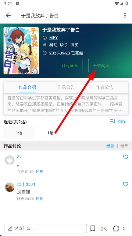 4、進(jìn)入漫畫詳情頁面,查看作品更新進(jìn)度、章節(jié)列表,點(diǎn)擊開始閱讀。