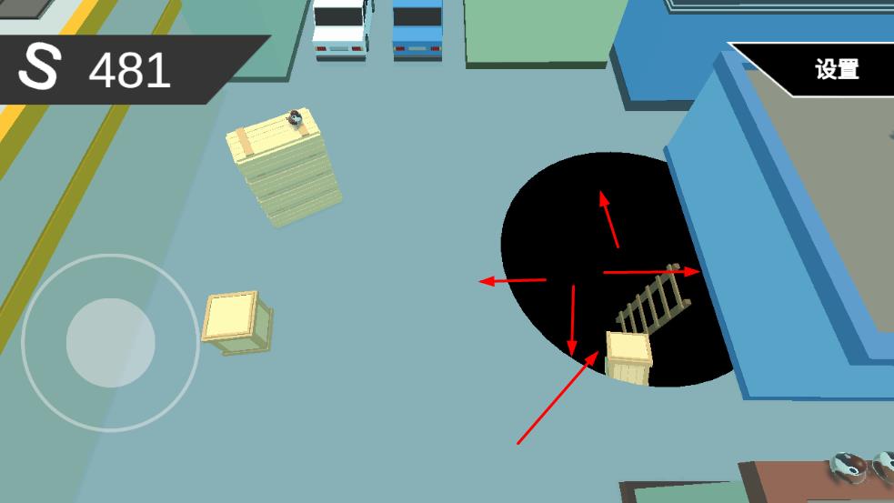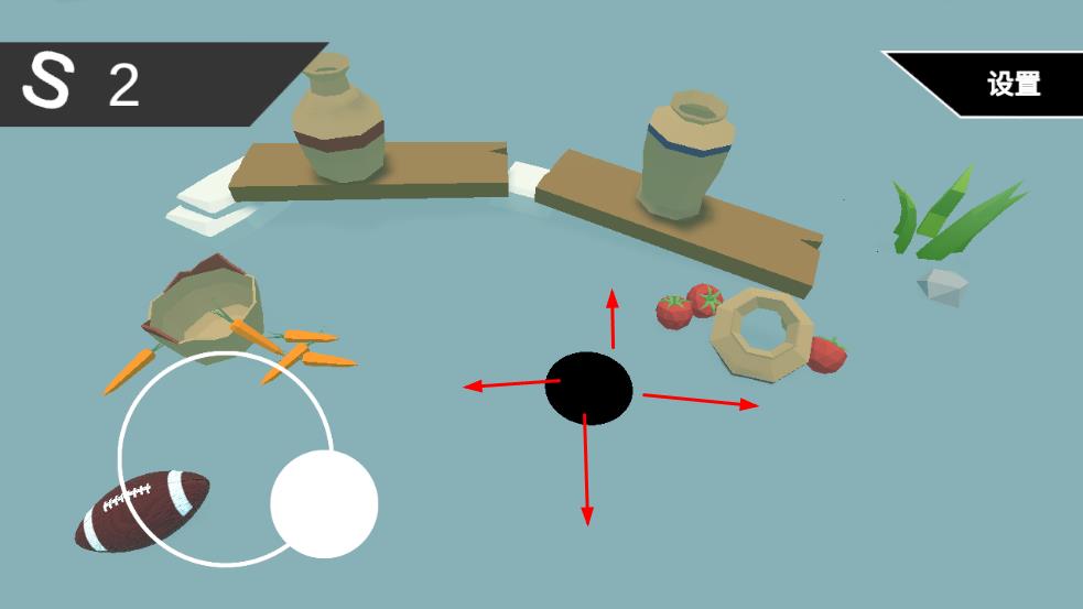 1、可控制黑洞向上下左右等方向移動,靠近周圍的陶罐、植物、木箱、梯子等物品。