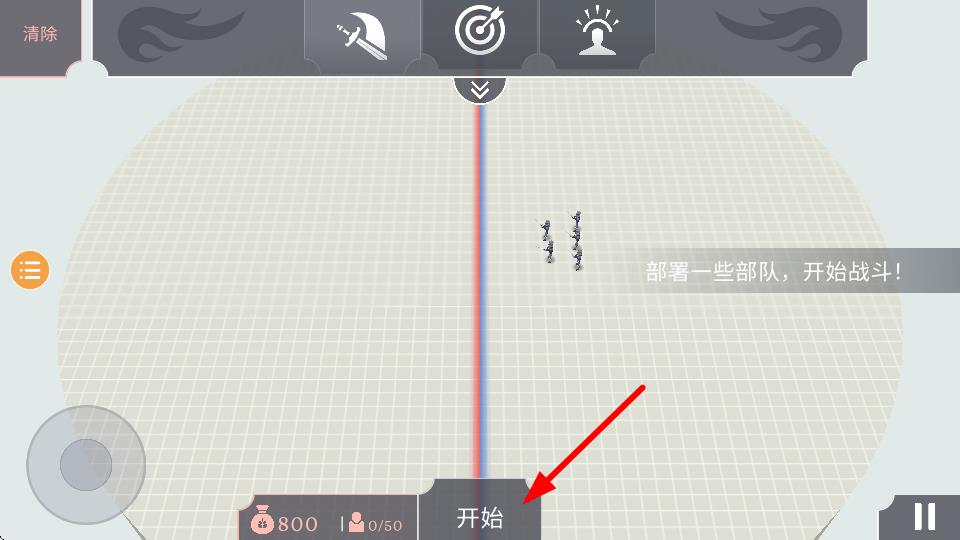 1、點擊開始按鈕,可開啟戰(zhàn)斗,在部署好部隊后,通過該操作部隊進入戰(zhàn)斗狀態(tài),推進游戲進程。