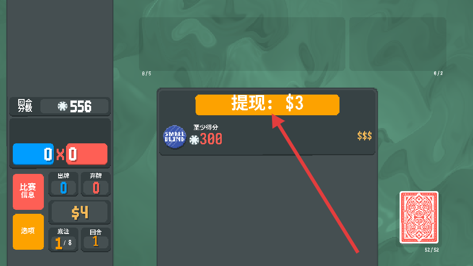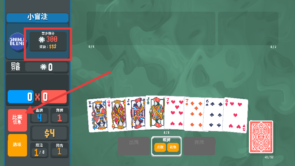 2、在對局界面,查看比賽信息可以了解如何出牌獲得高分,查看小盲注-至少得分300的要求,同時留意當前籌碼和回合分數(shù)。
