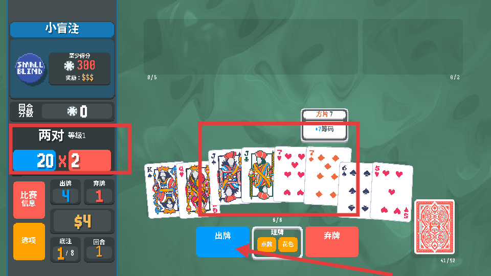 3、對局中,根據(jù)牌型(如出現(xiàn)對子7對子J)查看左側(cè)可以獲得的分數(shù),點擊出牌即可獲得得分。