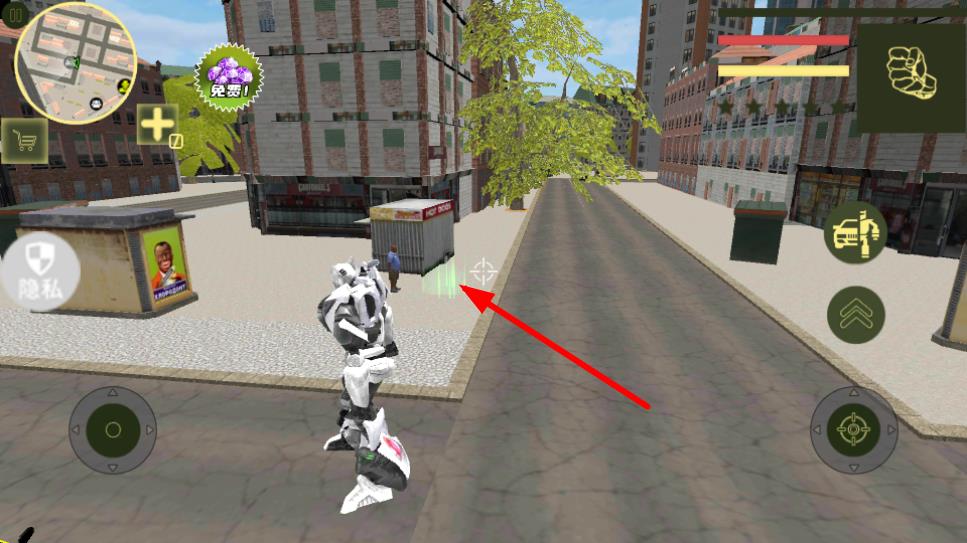1、瞄準箭頭指向的區(qū)域,可進行攻擊或互動操作,探索城市場景中資源或敵人,推進進程。