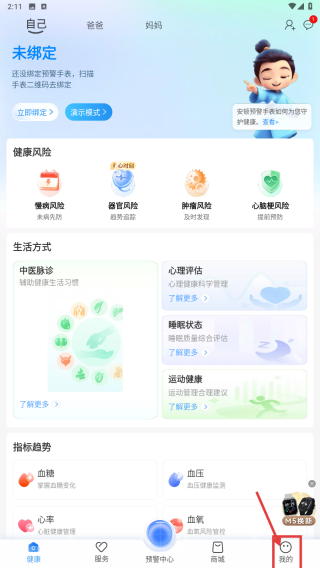 2、查看健康預(yù)警:在首頁“健康預(yù)警”板塊,可實時查看系統(tǒng)生成的健康風(fēng)險評估結(jié)果,若存在潛在風(fēng)險,點擊詳情可了解風(fēng)險類型、預(yù)警依據(jù)及對應(yīng)的健康建議。