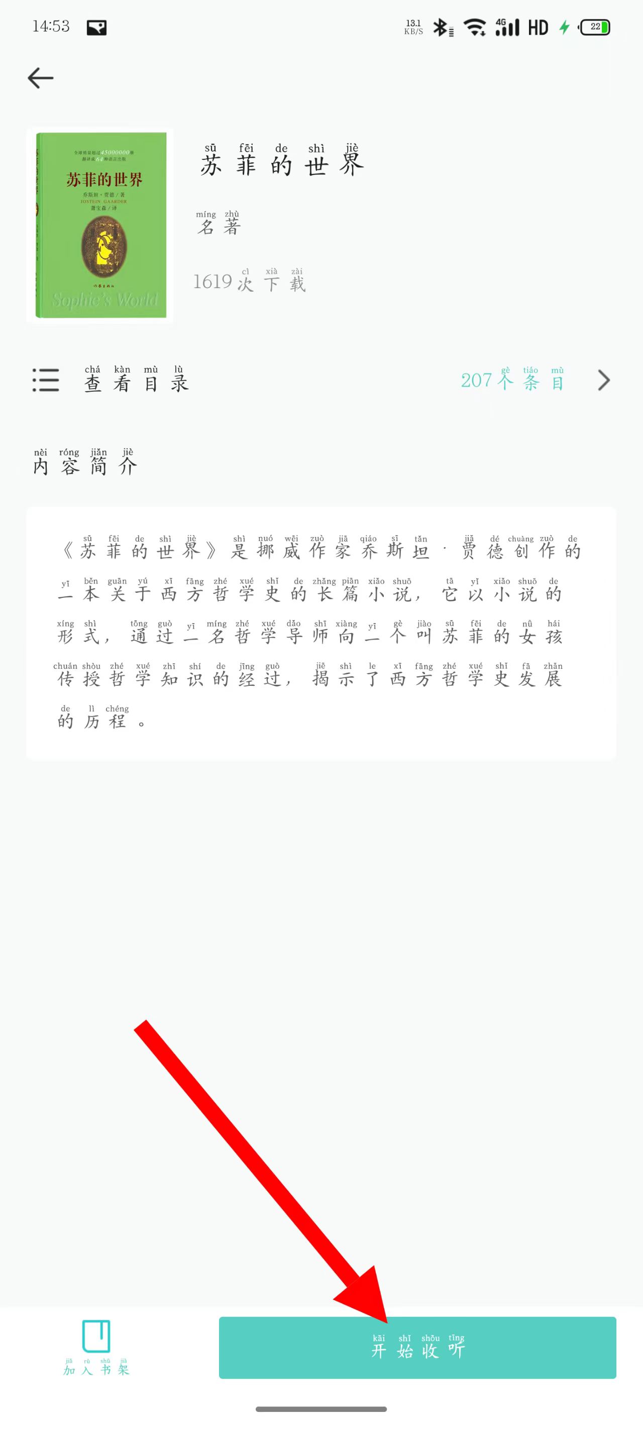 3. 進(jìn)入小說(shuō)詳情頁(yè),點(diǎn)擊開(kāi)始收聽(tīng)按鈕,進(jìn)入播放界面。