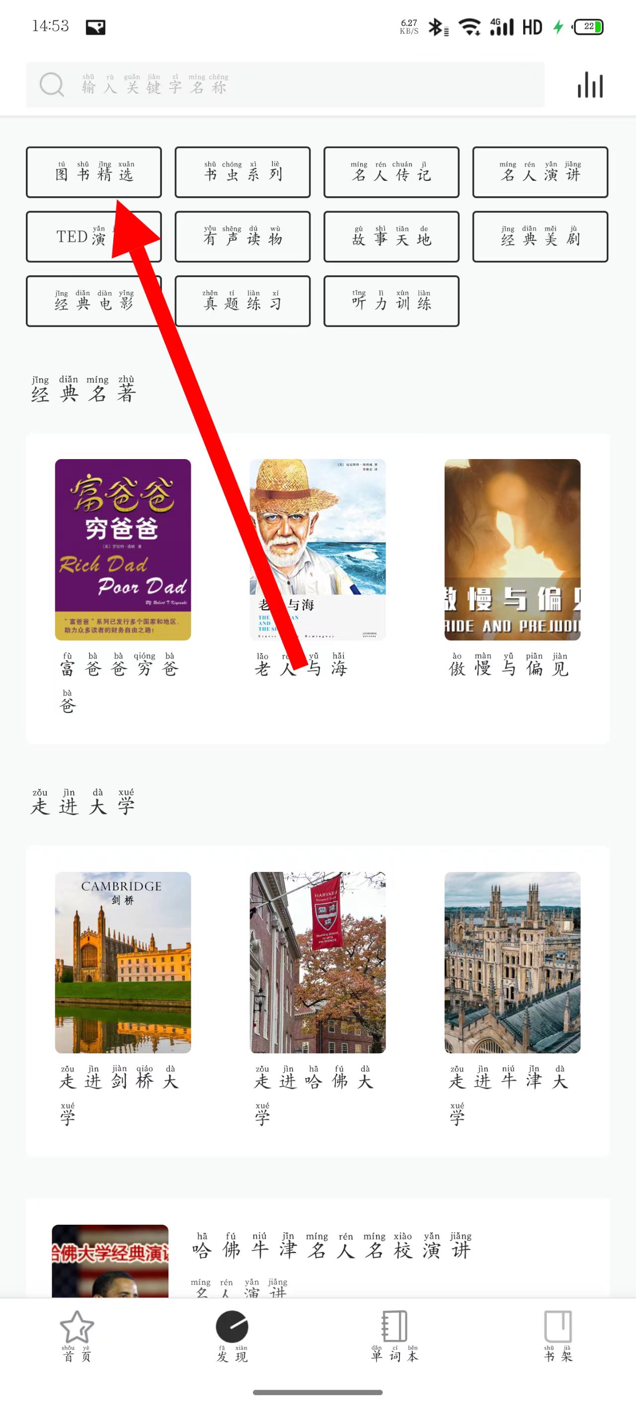 1. 打開(kāi)APP,點(diǎn)擊下方導(dǎo)航欄發(fā)現(xiàn),進(jìn)入后點(diǎn)擊圖書(shū)精選按鈕。