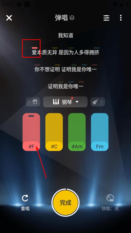 3、根據(jù)歌詞和提示,點擊對應(yīng)顏色的和弦按鈕,如#F,進行彈奏。